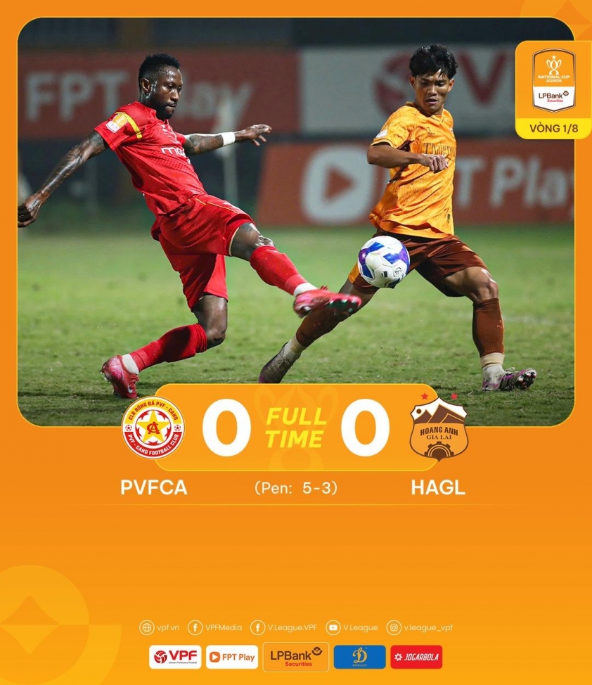 Không thể phân định trong 90 phút, hai đội phải bước vào loạt luân lưu cân não. Tại đây, PVF-CAND bản lĩnh hơn khi giành chiến thắng 5-3. Cao Hoàng Minh trở thành cầu thủ duy nhất sút hỏng bên phía HAGL, qua đó khép lại trận đấu đầy tiếc nuối cho đội bóng phố Núi.