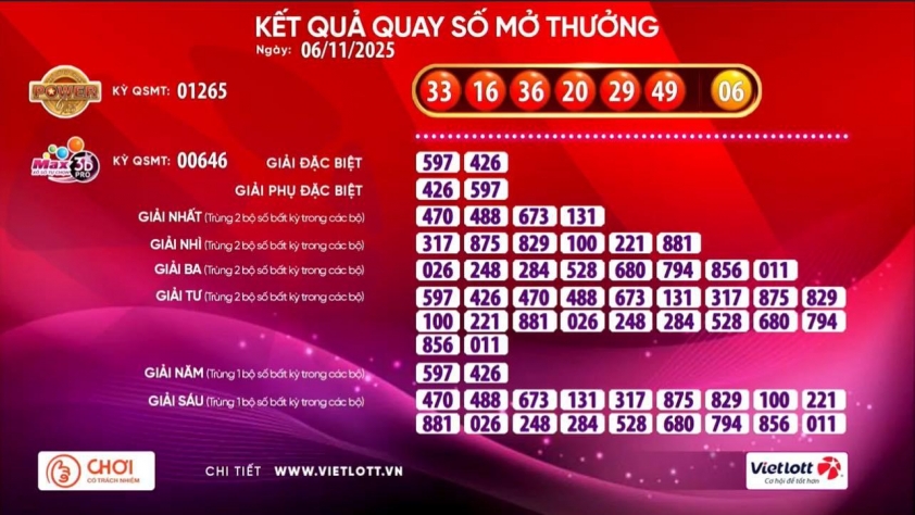 Trong ngày 7/11/2025, sẽ tiến hành quay các giải các giải Vietlott Power 6/45.