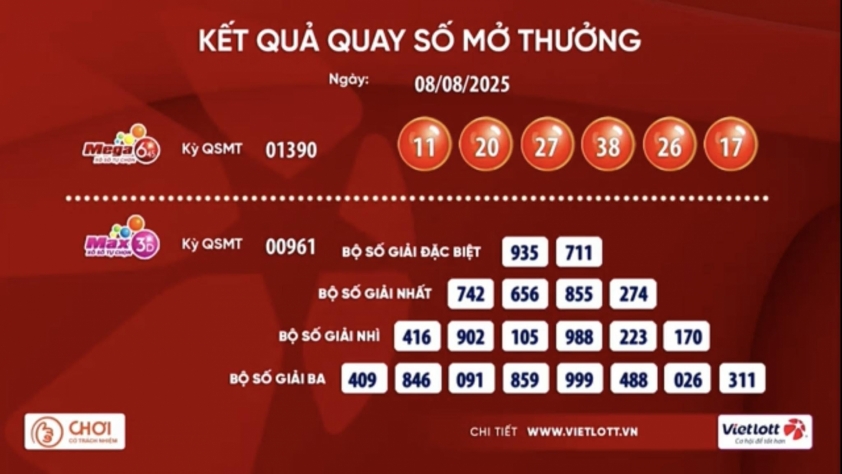 KẾT QUẢ XỔ SỐ VIETLOTT 8/8/2025 - THỨ SÁU