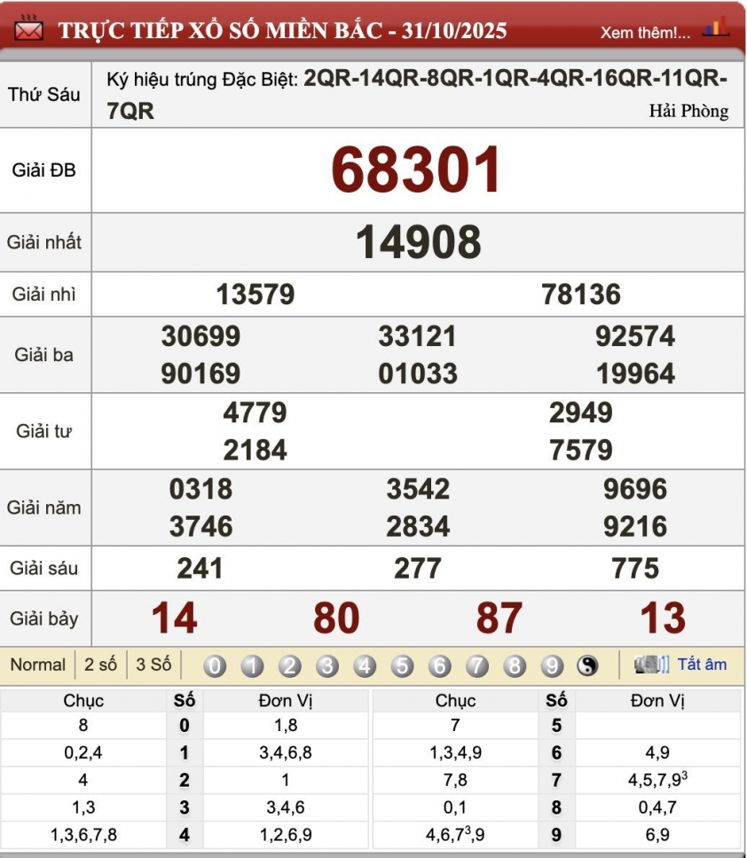 Kết quả xổ số miền Bắc (XSMB) hôm nay ngày 31/10
