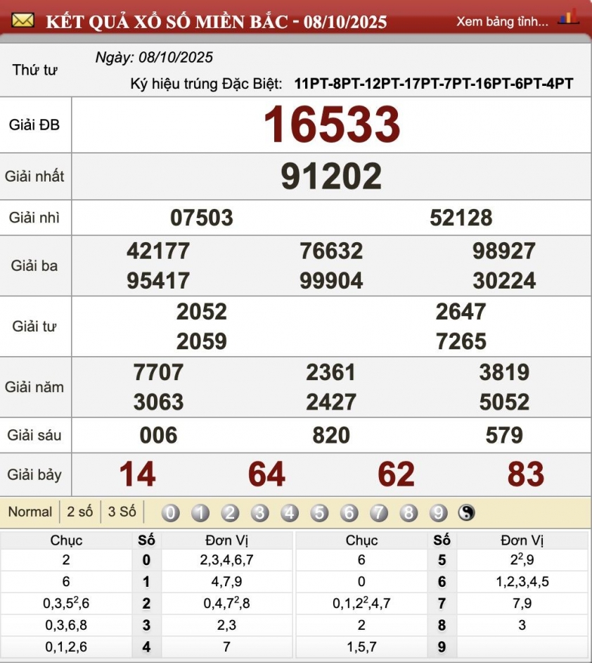 Kết quả xổ số miền Bắc (XSMB) hôm nay ngày 8/10
