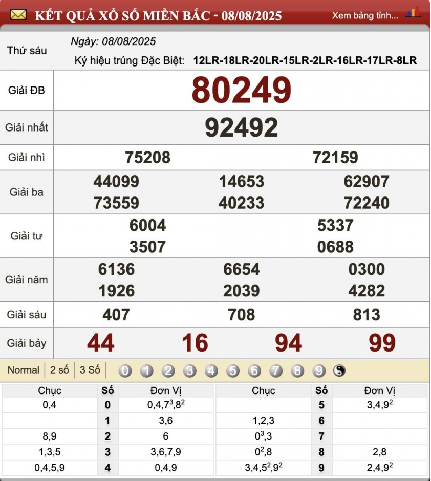 Kết quả xổ số miền Bắc (XSMB) hôm nay ngày 8/8