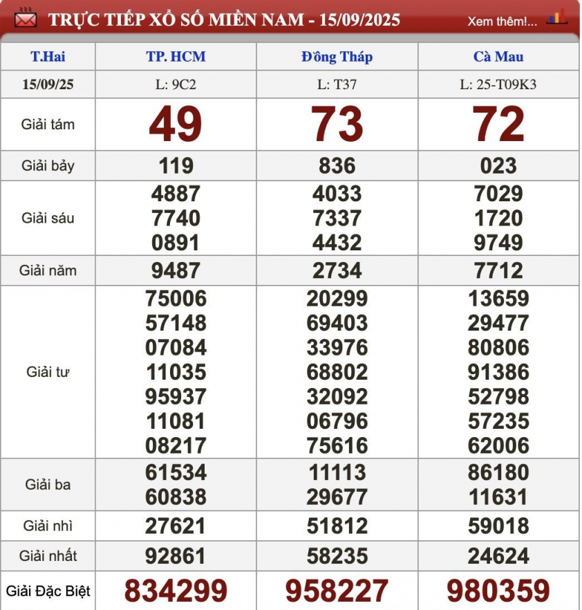 Kết quả xổ số miền Nam (XSMN) hôm nay ngày 15/9