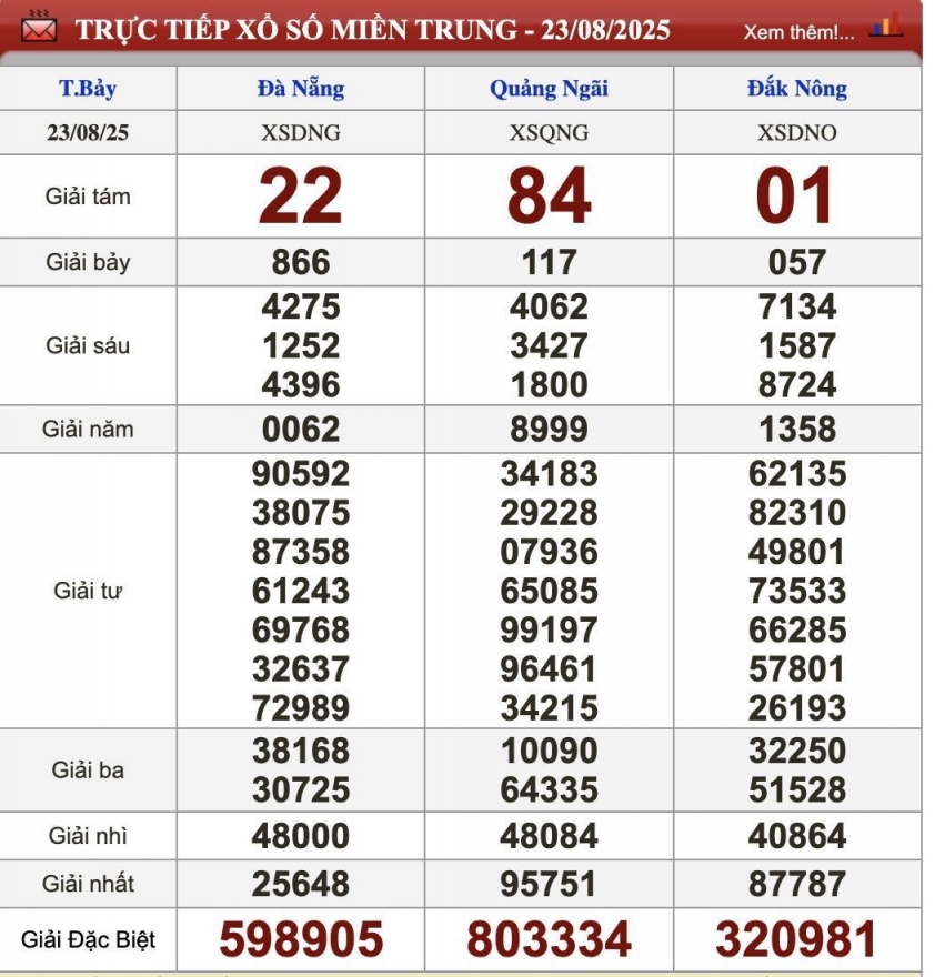 Kết quả xổ số miền Trung (XSMT) hôm nay ngày 23/8