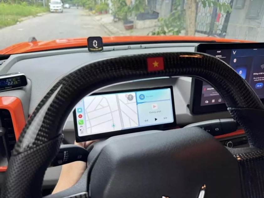Bên trong cabin, anh Hùng còn trang bị thêm bảng đồng hồ sau vô lăng, tích hợp tính năng xem bản đồ, nghe nhạc cùng nhiều tiện ích khác. Một bảng đo tốc độ cũng được gắn trên bảng táp-lô, giúp người lái dễ dàng kiểm soát tốc độ khi vận hành xe.