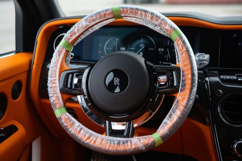 Một đường coachline màu cam Mandarin chạy dọc thân xe được vẽ thủ công bởi nghệ nhân của hãng, điểm nhấn đặc trưng chỉ có trên những chiếc Rolls-Royce được đặt chế tác riêng.
