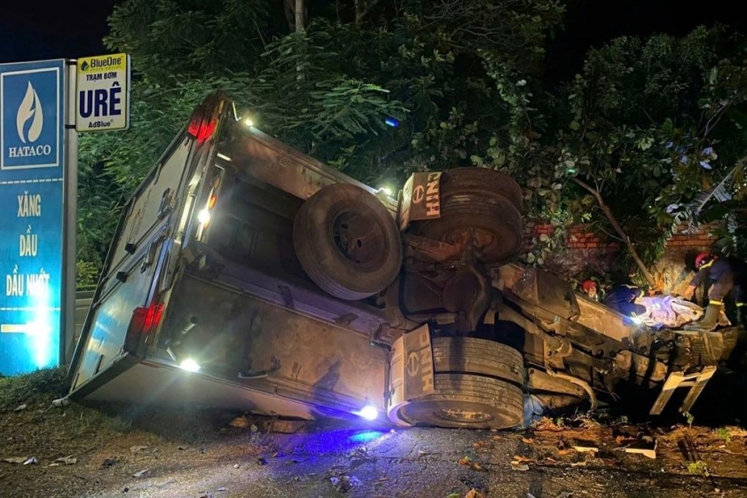Cú đâm mạnh khiến xe tải lật nghiêng xuống hố sâu bên đường. Trên xe có 3 người, trong đó 2 người bị thương đã được người dân nhanh chóng đưa đi cấp cứu. Riêng tài xế T. bị kẹt cứng trong cabin biến dạng, không thể thoát ra ngoài.