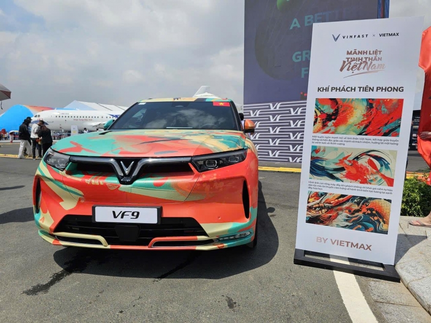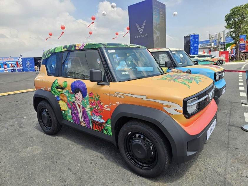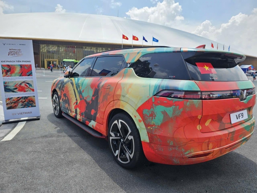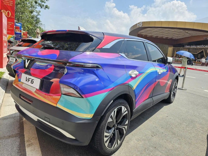 Không chỉ có máy bay, xe tăng hay các phương tiện quân sự hiện đại, khu vực trưng bày ngoài trời còn gây ấn tượng mạnh bởi sự xuất hiện của loạt xe điện VinFast. Những mẫu xe này khoác lên mình nhiều gam màu và họa tiết rực rỡ, khác biệt hoàn toàn so với phiên bản thương mại thường thấy.