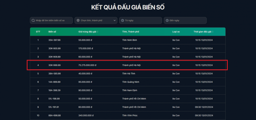 Phiên đấu giá biển số ô tô sáng ngày 13/01/2024 đã thu hút sự chú ý khi có sự xuất hiện của biển số 30K 999.99 đến từ Hà Nội.