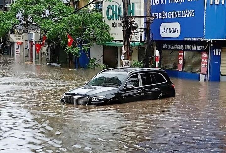 Không chỉ các phương tiện xe máy, nhiều ô tô, kể cả xe sang trị giá hàng tỷ đồng cũng bị nhấn chìm trong dòng nước ngập sâu, gây thiệt hại nặng nề cho chủ phương tiện.