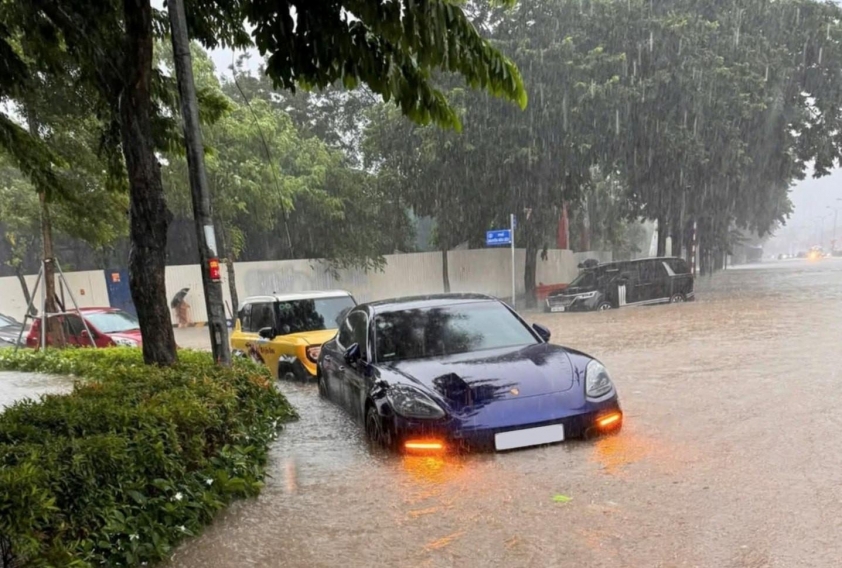 Không chỉ xe phổ thông, nhiều mẫu xe sang như Mercedes-Benz, Porsche trị giá hàng tỷ đồng cũng trở thành "nạn nhân" của mưa ngập ở Hà Nội