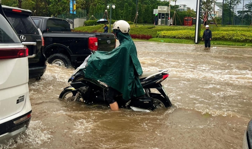 Trong khi hệ thống thoát nước chưa đồng bộ, nhiều tuyến đường biến thành "sông" sau mưa, có nơi nước ngập 30 - 40 cm.
