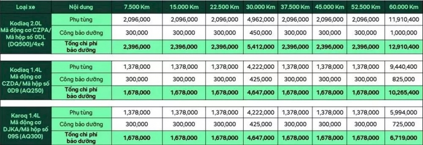 So với các hãng xe đối thủ, mức phí trung bình cho một lần bảo dưỡng định kỳ của xe Skoda rất cạnh tranh. Ví dụ, Skoda Kodiaq Style 2.0 bản cao cấp nhất bảo dưỡng lần đầu có chi phí chỉ 2,4 triệu và lần thứ 4 ở 30.000 km là khoảng 5,4 triệu đồng.