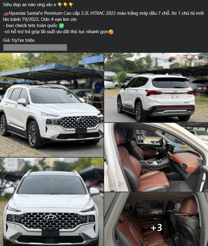 Theo tham khảo, một chiếc Hyundai Santa Fe sản xuất năm 2022 đang được một showroom chuyên kinh doanh xe đã qua sử dụng rao bán với mức giá khoảng 1,1xx tỷ đồng.