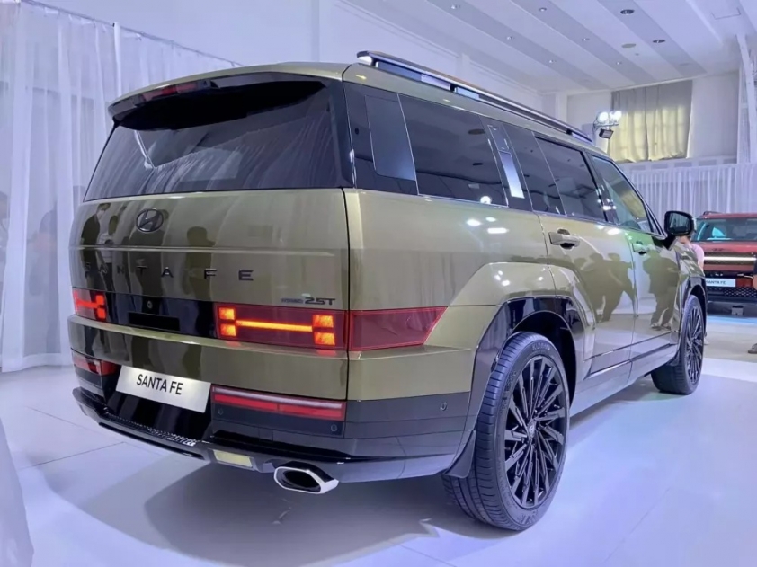 Khu vực đuôi xe có thiết kế khá đơn giản với cửa cốp bằng phẳng, tem chữ nổi "Santa Fe" cùng đèn hậu được đặt thấp ở hai bên. Bộ mâm xe dạng nan hoa dày đặc với đường kính lớn nhất lên đến 21 inch.