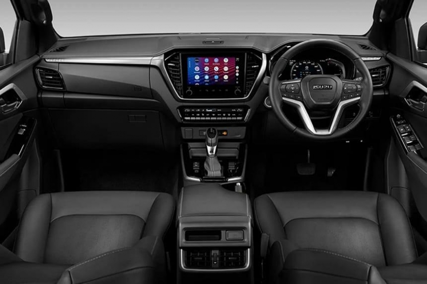 Bên trong cabin, Isuzu D-Max Hi-Lander 1.9 MHEV sở hữu bảng đồng hồ Super Vision với màn hình đa thông tin, màn hình cảm ứng trung tâm 9 inch hỗ trợ kết nối Android Auto có dây và Apple CarPlay không dây, ghế bọc da tổng hợp, vô lăng bọc da tích hợp phím chức năng, nút khởi động máy, khởi động từ xa, hệ thống âm thanh 8 loa và kết nối Bluetooth.