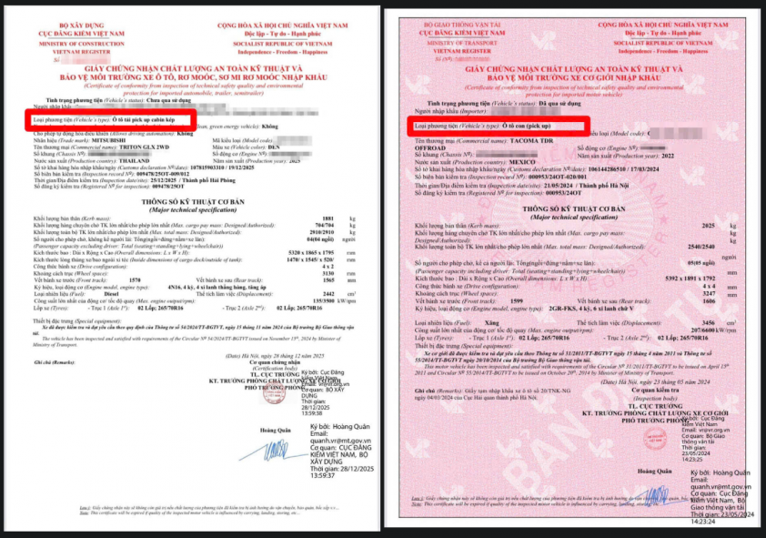 Điểm quan trọng được cơ quan chức năng nhấn mạnh là việc xác định một chiếc xe bán tải thuộc nhóm ô tô con hay ô tô tải không dựa vào cách gọi thông thường mà phải căn cứ trên thông số kỹ thuật cụ thể của từng phương tiện. Việc phân loại này do cơ quan có thẩm quyền về đăng kiểm thực hiện, gồm Cục Đăng kiểm Việt Nam hoặc các trung tâm đăng kiểm xe cơ giới.