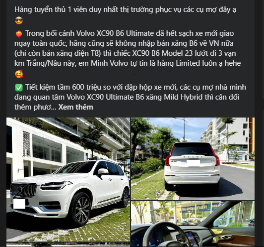 Theo tham khảo, một showroom chuyên kinh doanh xe đã qua sử dụng đang chào bán chiếc Volvo XC90 B6 Ultimate sản xuất năm 2023 với mức giá khoảng 3,4xx tỷ đồng.