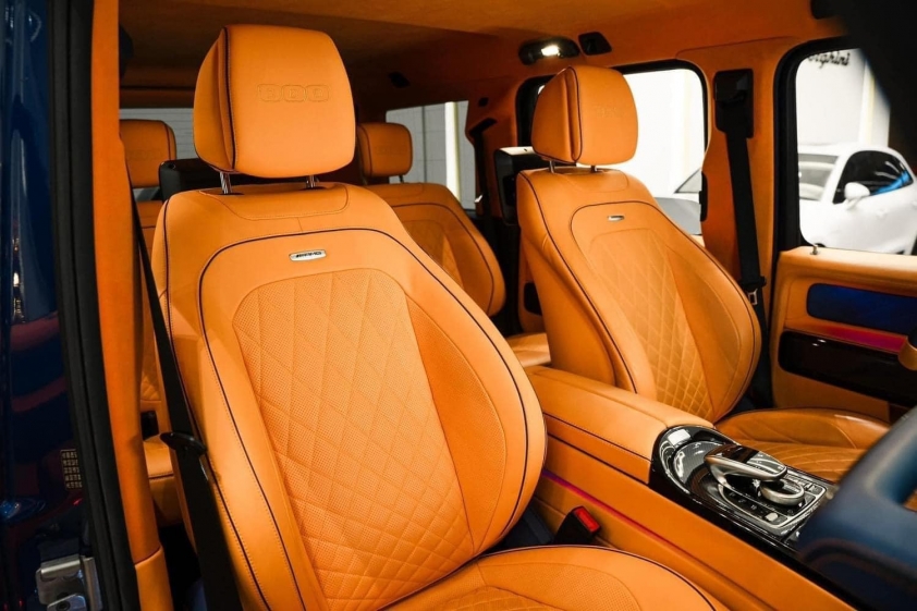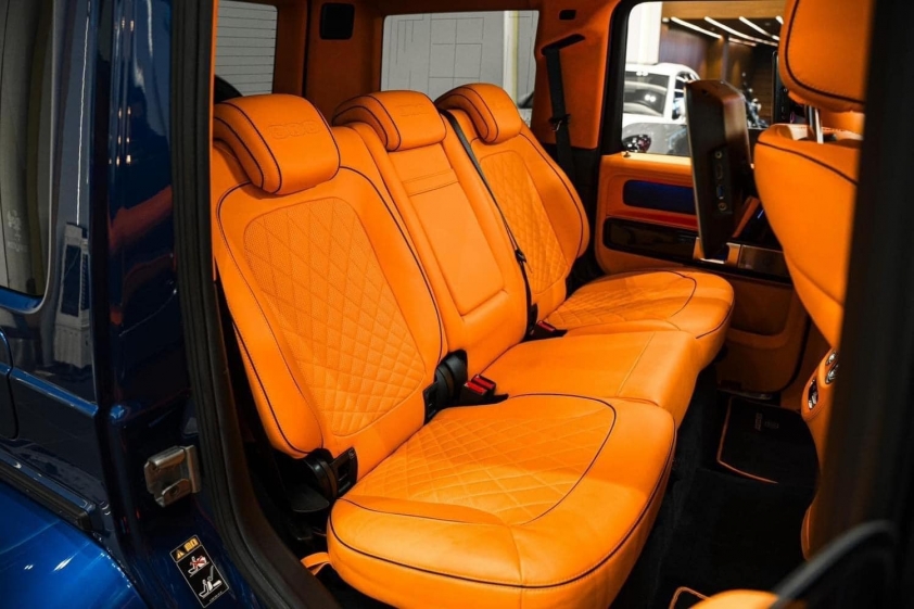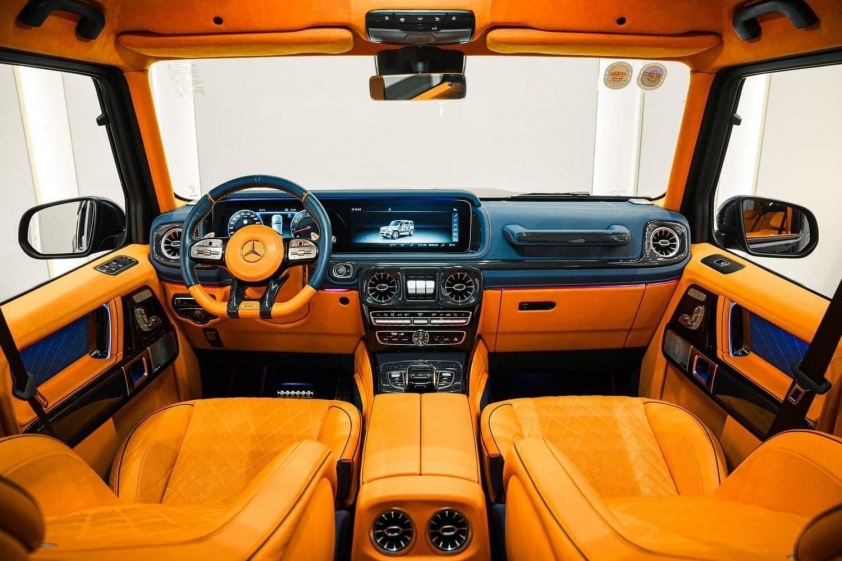 Vào bên trong khoang lái, nội thất của Mercedes Brabus G800 có tông màu cam chủ đạo cùng một số chỗ nhấn nhá màu xanh dương trùng màu ngoại thất. Những trang bị tiện nghi đáng chú ý có: