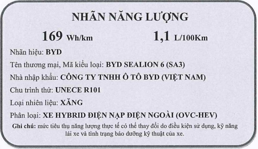 BYD Sealion 6 ghi điểm nhờ khả năng tiết kiệm nhiên liệu vượt trội. Mẫu xe chỉ tiêu thụ 1,1 lít xăng/100 km và mức tiêu thụ điện năng là 169 Wh/km.
