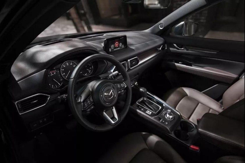 Khoang nội thất của CX-5 Deluxe đầy đủ tiện nghi với ghế bọc da, ghế lái chỉnh điện 10 hướng, kính cửa sổ chỉnh điện một chạm ở tất cả vị trí, màn hình giải trí trung tâm 8 inch hỗ trợ Apple CarPlay/Android Auto, gương chiếu hậu chống chói tự động, điều hòa hai vùng độc lập và hệ thống âm thanh 6 loa.