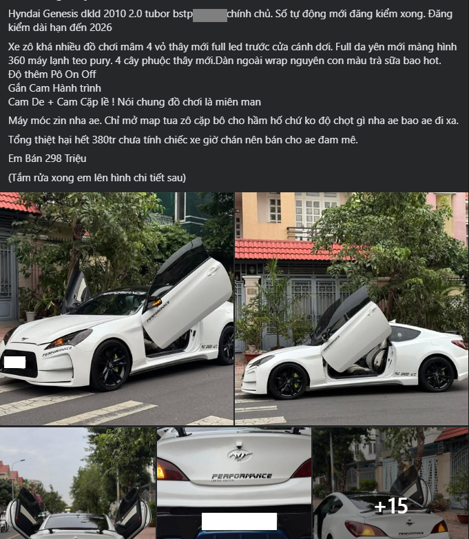 Một ví dụ điển hình là chiếc Genesis Coupe đang được rao bán với giá 298 triệu đồng - mức giá ngang với một mẫu xe điện cỡ nhỏ như VinFast VF 3 (299 triệu đồng).
