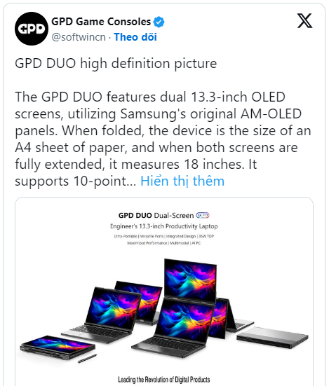Theo chia sẻ của GPD trong một bài đăng trên X: "Khi gập lại, thiết bị có kích thước bằng một tờ giấy A4, và tăng lên đến 18 inch khi cả hai màn hình được mở rộng hoàn toàn".