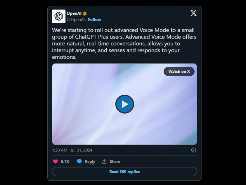 Trong bài đăng, OpenAI chia sẻ: "Chúng tôi bắt đầu triển khai chế độ giọng nói nâng cao cho một nhóm nhỏ người dùng ChatGPT Plus. Chế độ giọng nói nâng cao mang lại cuộc hội thoại tự nhiên hơn, thời gian thực, cho phép bạn ngắt lời bất cứ lúc nào và cảm nhận cũng như phản ứng với cảm xúc của bạn".