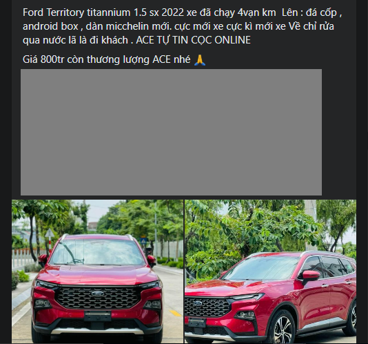 Tham khảo thị trường xe đã qua sử dụng, một chiếc Ford Territory sản xuất năm 2022 đang được rao bán với mức giá khoảng 800 triệu đồng.