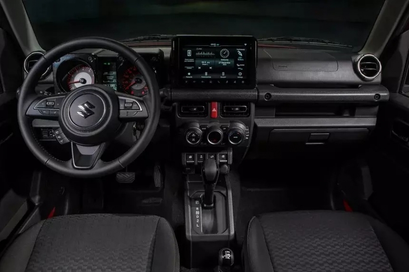 Những trang bị tiện nghi tiêu chuẩn trên Suzuki Jimny 5 cửa có vô-lăng tích hợp phím chỉnh âm lượng, bảng đồng hồ analog tích hợp màn hình đa thông tin nhỏ, màn hình cảm ứng trung tâm 7 inch, hỗ trợ Apple CarPlay/Android Auto và dàn âm thanh 4 loa.