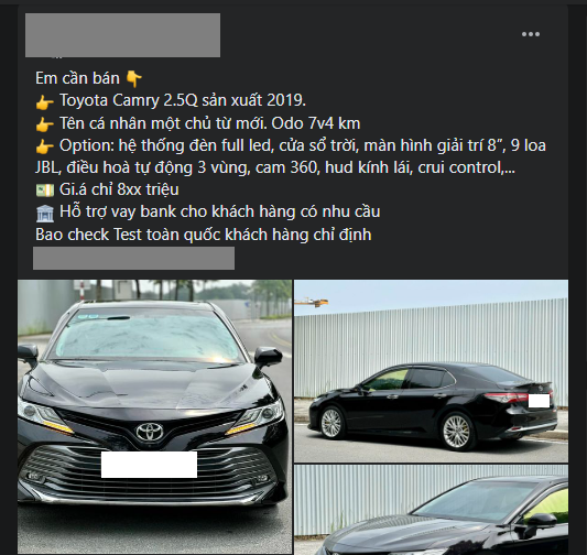Theo tham khảo, một salon chuyên kinh doanh xe cũ đang chào bán một chiếc Toyota Camry sản xuất năm 2019 với mức giá khoảng 8xx triệu đồng.