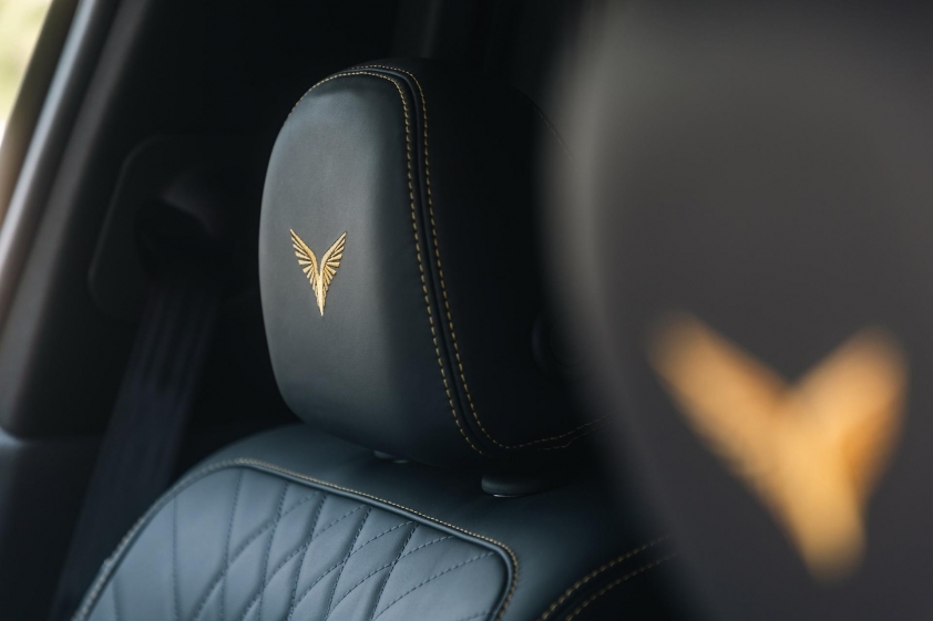 Ghế ngồi bọc da với chỉ khâu vàng nổi bật, tựa đầu thêu biểu tượng cánh chim Lạc cách điệu.Khu vực điều khiển trung tâm ốp gỗ Golden Nanmu, đi kèm núm xoay điều chỉnh và viền nút bấm cần số đều được mạ vàng thủ công.