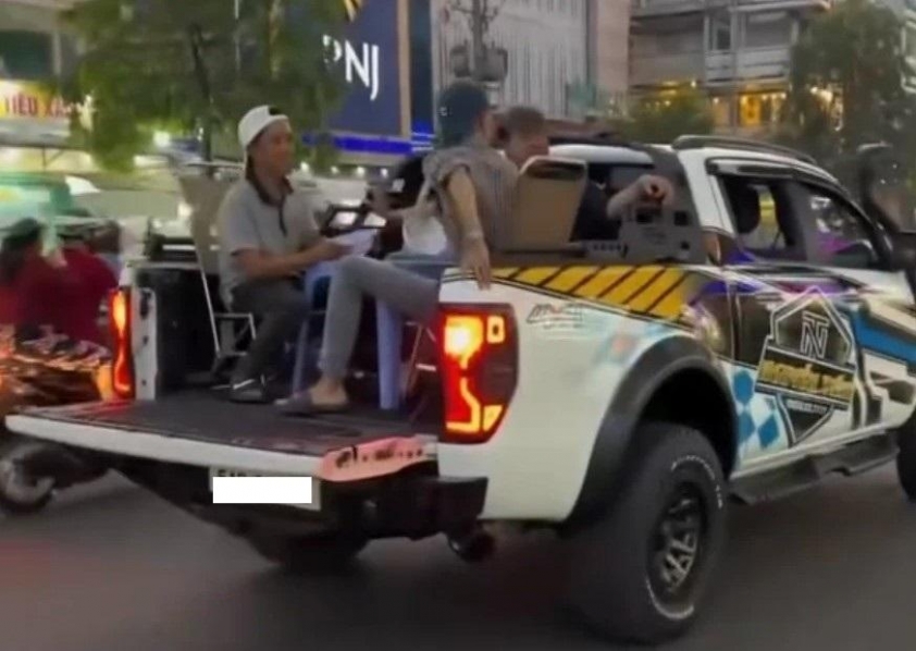 Ngày 19/3, mạng xã hội xuất hiện đoạn video ghi lại cảnh một nhóm người ngồi trên thùng sau xe bán tải, bày bàn ghế để ăn uống khi phương tiện đang di chuyển trên đường Hậu Giang (phường Bình Tây, TP.HCM).