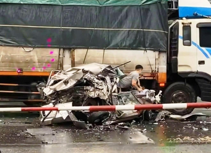 Cú va chạm mạnh khiến xe đầu kéo đâm trực diện vào đuôi ô tô con, khiến phương tiện này bị văng vào gầm sau xe tải phía trước. Cả ba xe đều bị hư hỏng nặng, trong đó chiếc ô tô con gần như bẹp rúm, biến dạng hoàn toàn.