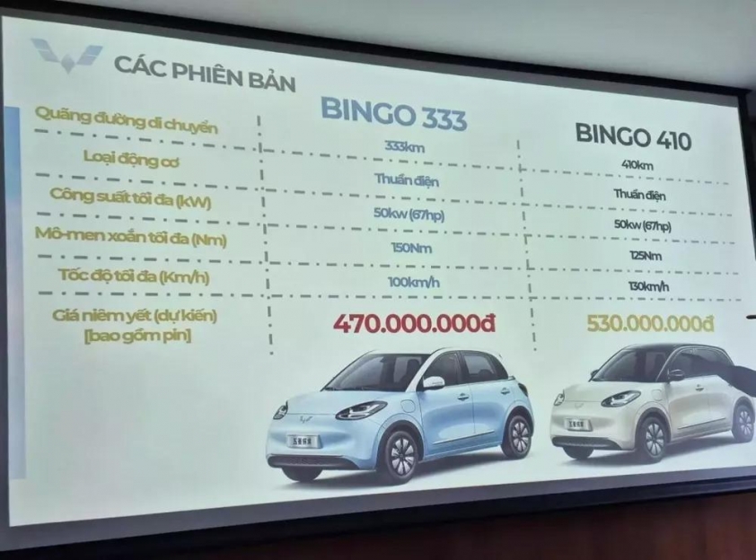 Mức giá dự kiến lần lượt là 470 triệu đồng cho phiên bản Bingo 333 và 530 triệu đồng cho phiên bản Bingo 410, giá này đã bao gồm pin.
