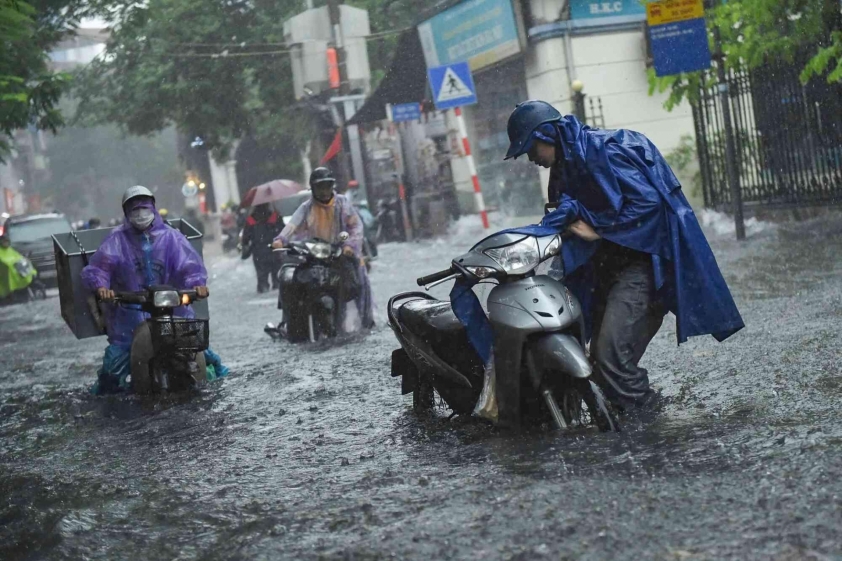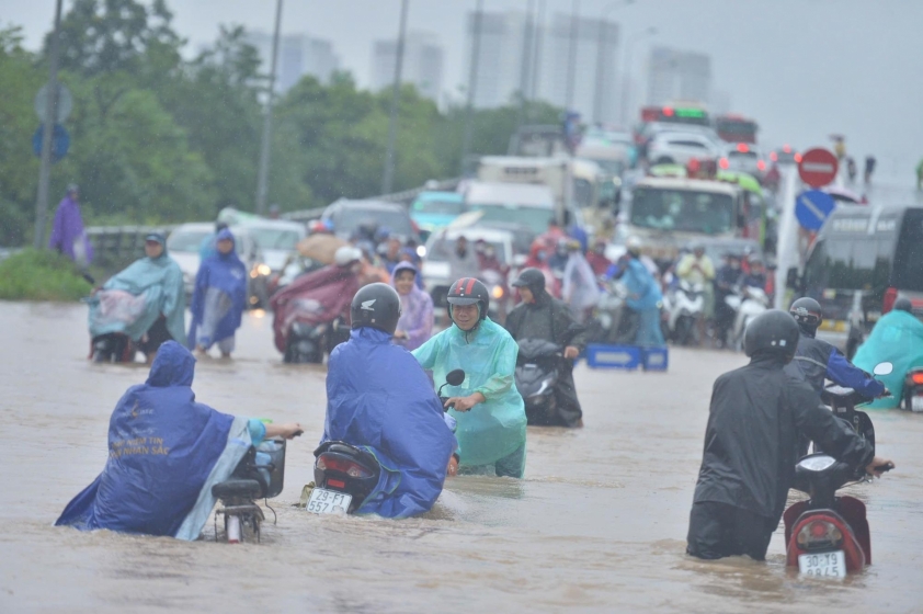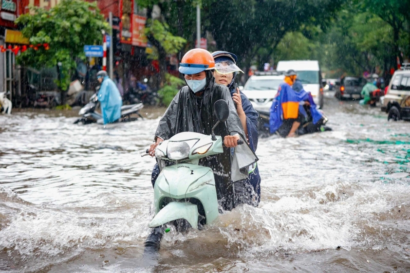 Trận mưa lớn tại Hà Nội do ảnh hưởng của hoàn lưu bão số 5 (Kajiki) đã khiến nhiều tuyến phố rơi vào tình trạng ngập sâu. Dòng người đi làm buổi sáng vốn đã đông đúc nay lại càng vất vả hơn khi phải bì bõm giữa "biển nước".