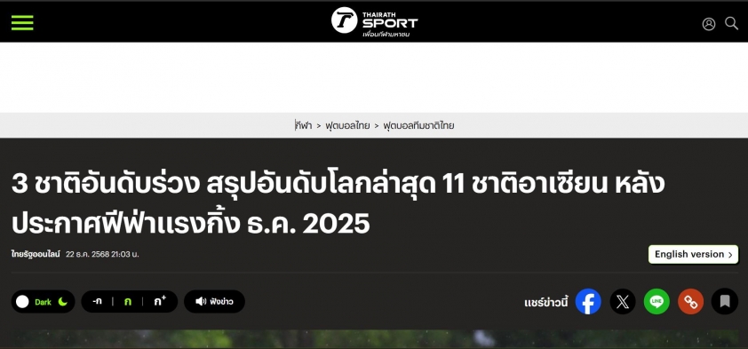 Đội tuyển Việt Nam tăng 3 bậc trên BXH FIFA, trở thành đội thăng tiến mạnh nhất Đông Nam Á, khiến báo chí Thái Lan dậy sóng và đặc biệt chú ý tới sự vươn lên rõ rệt này.