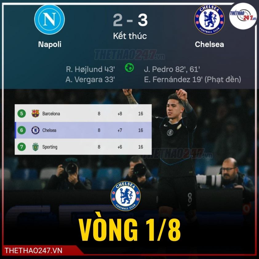 Chelsea tạo nên cú ngược dòng giàu cảm xúc trên sân Napoli. Enzo Fernandez mở tỷ số từ chấm phạt đền, nhưng đội chủ nhà đáp trả mạnh mẽ với hai bàn thắng của Antonio Vergara và Rasmus Hojlund. Bước ngoặt đến khi Cole Palmer vào sân trong hiệp hai. Ngôi sao người Anh kiến tạo cả hai bàn cho Joao Pedro, giúp Chelsea thắng ngược 3-2, qua đó loại Napoli và ghi tên mình vào top 8 đội mạnh nhất.