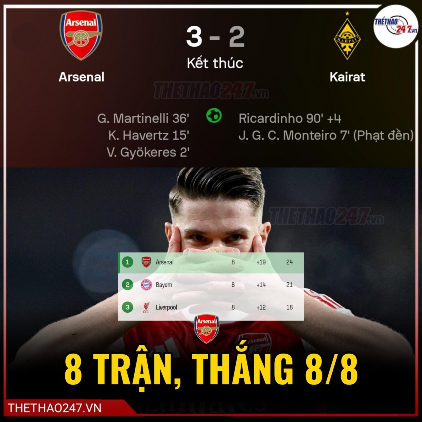 Trong khi đó, Arsenal khép lại vòng league phase bằng thành tích toàn thắng. Đoàn quân của Mikel Arteta vượt qua Kairat 3-2 trong trận cầu sôi động tại Emirates. Viktor Gyokeres, Kai Havertz và Gabriel Martinelli lần lượt lập công, giúp “Pháo thủ” thắng trọn 8 trận, trở thành đội có phong độ ấn tượng bậc nhất Champions League mùa này.