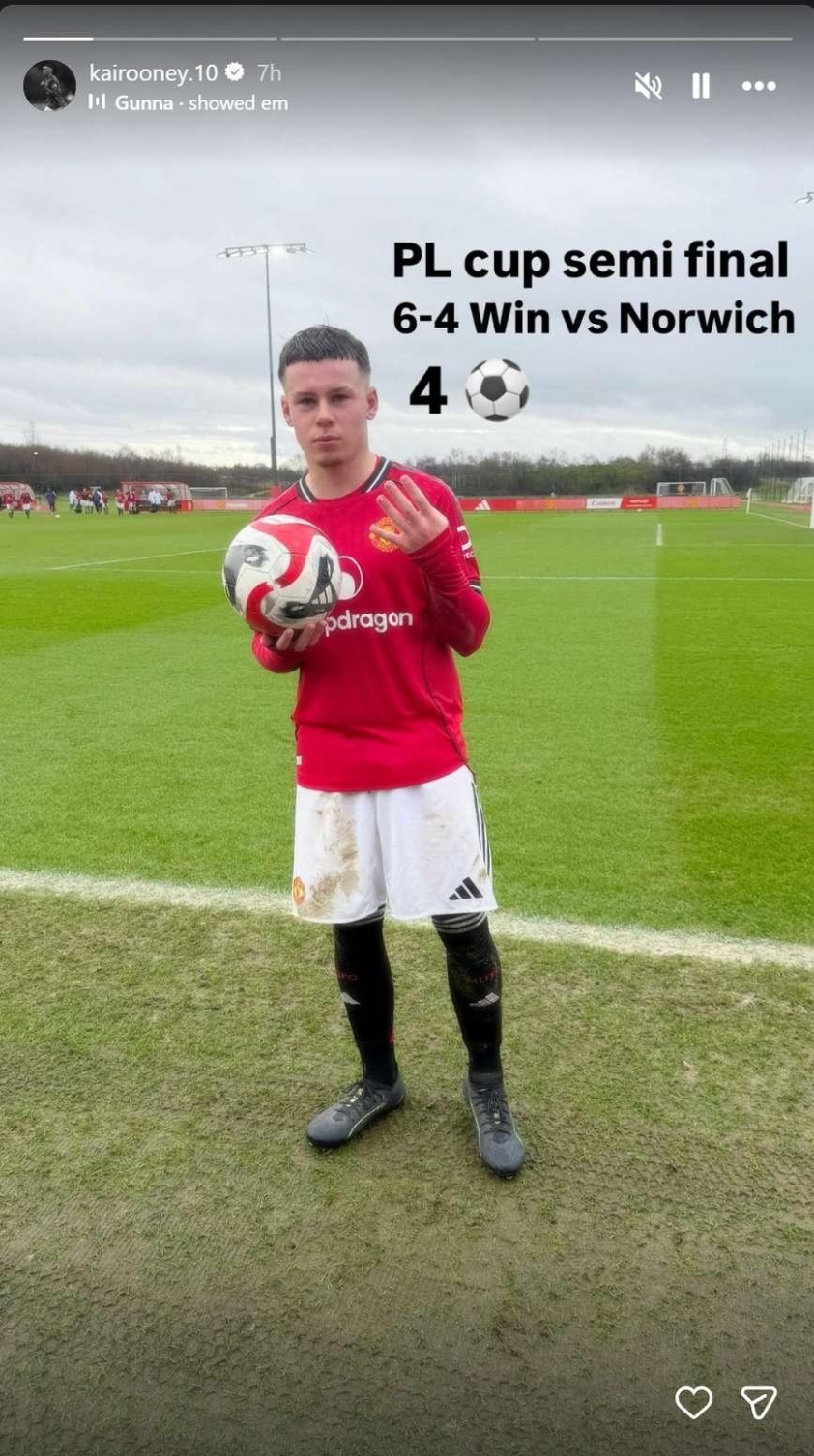 Trong trận bán kết Premier League Cup dành cho lứa U16 diễn ra cuối tuần qua, Kai Rooney đã có màn trình diễn xuất sắc, góp công lớn giúp đội trẻ Man United giành chiến thắng nghẹt thở 6-4 trước Norwich City. Sau trận, tiền đạo 16 tuổi hào hứng đăng tải hình ảnh quả bóng kỷ niệm lên Instagram, phần thưởng dành cho cú hat-trick, kèm theo niềm tự hào rõ rệt về màn trình diễn của bản thân.