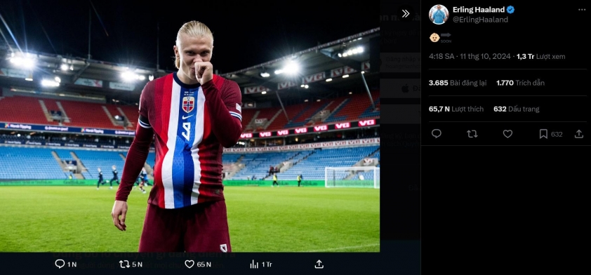 Tiền đạo của Manchester City đã ghi cú đúp trong chiến thắng 3-0 của đội tuyển Na Uy trước Slovenia tại Nations League vào rạng sáng 11/10 (giờ Việt Nam). Thành tích trên giúp anh trở thành cầu thủ ghi bàn nhiều nhất trong lịch sử đội tuyển quốc gia. Sau trận đấu, cầu thủ 24 tuổi đã lên mạng xã hội, có vẻ như để úp mở rằng anh sắp trở thành bố.