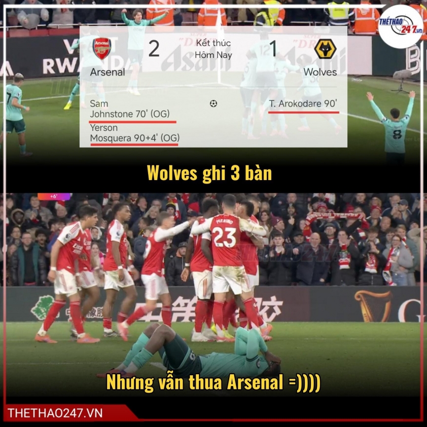 Tưởng chừng chiến thắng đã nằm chắc trong tay đội chủ sân Emirates, thì kịch tính bùng nổ ở phút 90. Matheus Mané treo bóng chuẩn xác vào vòng cấm, tạo điều kiện để Toluwalase Emmanuel Arokodare bật cao đánh đầu tung lưới David Raya, quân bình tỷ số 1-1 cho Wolves.