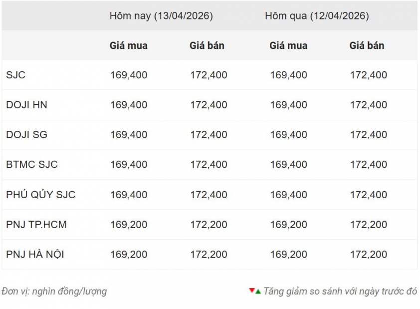 Ghi nhận lúc 8h ngày 13/4, giá vàng miếng tại Doji và SJC được niêm yết ở mức 169,4 triệu đồng/lượng chiều mua vào và 172,4 triệu đồng/lượng chiều bán ra, đi ngang so với phiên giao dịch trước.