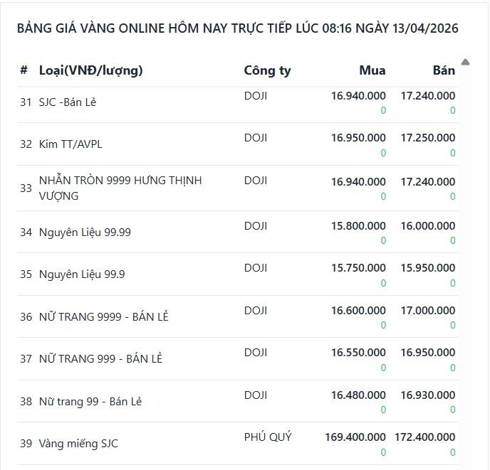 Giá vàng 9999 hôm nay 13/4/2026