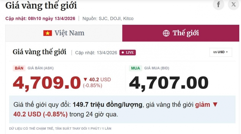 Giá vàng thế giới ngày 13/4 ghi nhận xu hướng điều chỉnh nhẹ khi giảm 40,2 USD xuống còn khoảng 4.709 USD/ounce, tương đương khoảng 149,7 triệu đồng/lượng. Dù vậy, tâm lý thị trường vẫn khá tích cực khi khảo sát mới nhất của Kitco cho thấy phần lớn chuyên gia và nhà đầu tư tiếp tục kỳ vọng giá vàng sẽ tăng trong tuần tới.