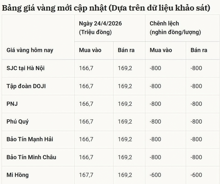 Giá vàng trong nước ngày 24/4/2026 tiếp tục điều chỉnh giảm trên diện rộng tại hầu hết các hệ thống kinh doanh lớn. Cụ thể, vàng miếng SJC tại Hà Nội, DOJI, PNJ, Phú Quý, Bảo Tín Mạnh Hải và Bảo Tín Minh Châu đều được niêm yết quanh mức 166,7 triệu đồng/lượng mua vào và 169,2 triệu đồng/lượng bán ra, đồng loạt giảm khoảng 800.000 đồng/lượng so với phiên trước.