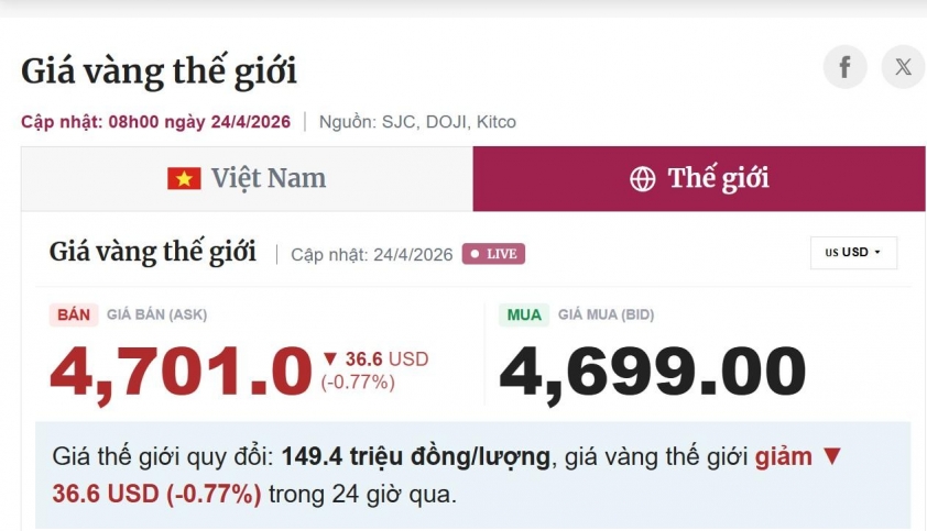 Giá vàng thế giới ngày 24/4/2026 ghi nhận xu hướng giảm nhẹ sau khi vừa trải qua giai đoạn tăng nóng. Cụ thể, giá vàng giao ngay dao động quanh mức khoảng 4.730 USD/ounce, giảm từ 6–30 USD tùy thời điểm so với phiên trước đó.