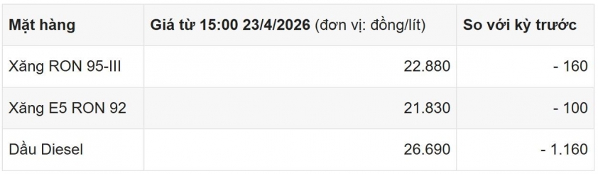 Từ 15h ngày 23/4, giá xăng đã chính thức lùi xuống dưới mốc 23.000 đồng mỗi lít. Cụ thể, xăng RON 95-III, loại phổ biến trên thị trường giảm 160 đồng, còn 22.880 đồng/lít, trong khi xăng E5 RON 92 cũng giảm 100 đồng, xuống mức 21.830 đồng/lít. Đây là lần điều chỉnh giúp chi phí nhiên liệu “dễ thở” hơn, nhất là trong bối cảnh giá cả nhiều mặt hàng khác vẫn còn biến động.