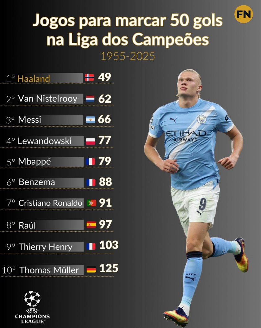 Ngôi sao người Na Uy đã đánh đầu mở tỷ số cho Manchester City trong cuộc tiếp đón Napoli tại Etihad, qua đó hoàn tất bàn thắng thứ 50 chỉ sau 49 trận ra sân. Thành tích này vượt xa kỷ lục cũ của Ruud van Nistelrooy (cựu tiền đạo Man United và Real Madrid) người cần tới 62 trận. Lionel Messi từng chạm mốc 50 bàn sau 66 trận, vẫn giữ danh hiệu cầu thủ trẻ nhất đạt được thành tích này ở tuổi 24 và 284 ngày. Haaland, 25 tuổi, đã vượt qua Kylian Mbappé để vươn lên vị trí thứ hai trong bảng xếp hạng này.