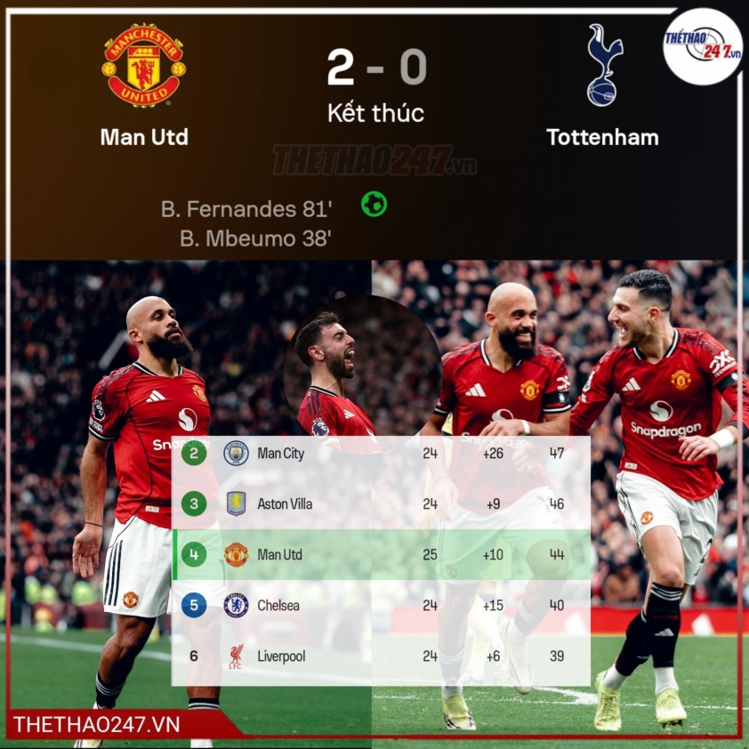Trận thắng trước Tottenham giúp Quỷ đỏ giữ vững vị trí thứ 4 trên bảng xếp hạng, chỉ còn kém top 2 của Man City đúng 3 điểm, trong khi Tottenham tụt xuống vị trí thứ 14 sau một màn trình diễn đáng thất vọng.